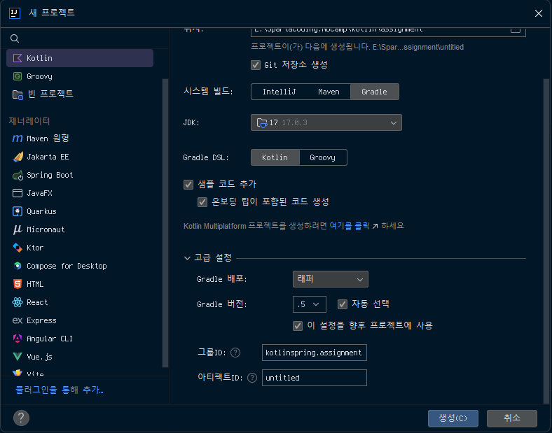 IntelliJ IDEA에서 새 프로젝트를 만들 때도 고급 설정에서 Group ID와 Artifact ID를 설정할 수 있다. 하지만 여기선 패키지명을 만들 때 Artifact ID를 포함시키지 않는다. 예를 들어, Group ID를 spartacodingclub.nbcamp.kotlinspring.assignment라고 하고 Artifact ID를 Calculator라고 정한 뒤 프로젝트 생성을 하면, 패키지명은 spartacodingclub.nbcamp.kotlinspring.assignment로 Group ID를 그대로 따라가게 된다. 같은 Group ID를 쓰는 복수의 프로젝트가 있을 경우 이런 상황에서 패키지명만 보고 혼란이 생길 것 같았다.