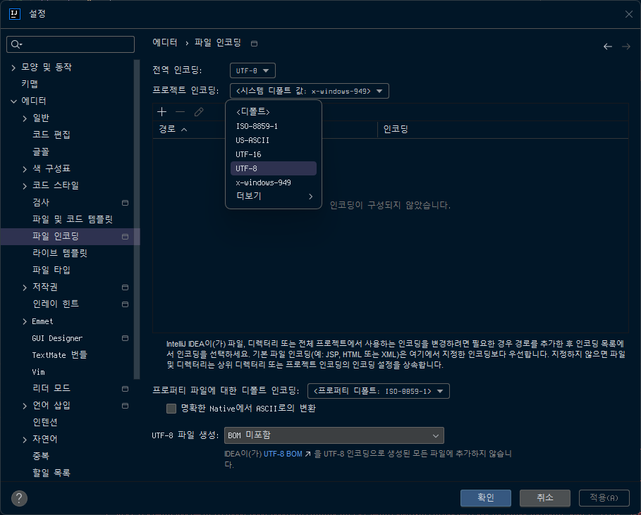 설정 > 에디터 > 파일 인코딩에서 다음 3개 항목에 대해 인코딩을 모두UTF-8로 변경해준다: