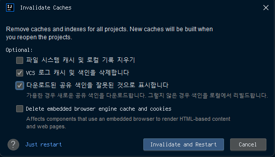 파일 > 캐시 무효화...로 아래 둘 항목을 선택한 후무효화 후 재시작을 눌러줘야 한다. 그렇지 않을 경우build.gradle이나idea.vmoptions에서 변경한 항목들이 적용되지 않는다.