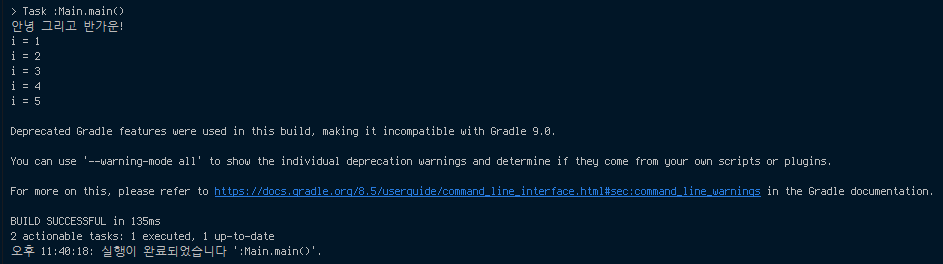 }-같이 한글 주석이 들어가 있었다. (중간의 한글 출력 코드는 본인이 넣은 것이다). 빌드를 실행했더니